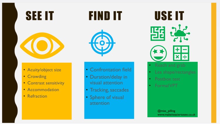 The overriding principle is to demonstrate areas of visual function, and highlight visual tasks which the child finds more challenging – this then will form the basis of a report alongside simple suggestions of how to Make It Easier for the child to see. While a formal diagnosis of cerebral visual impairment may be necessary for sight impairment registration or accessing services, the impact of a parent or teacher understanding HOW a child sees should not be underestimated.