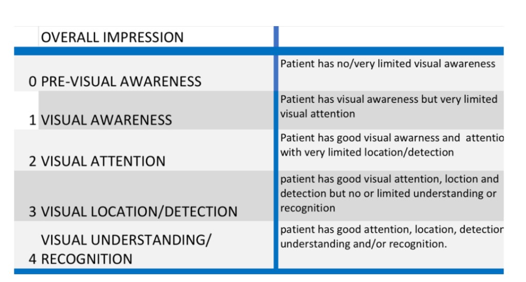 The ViBe Matrix presupposes that a child’s vision typically develops in a stepwise fashion, starting with limited awareness, progressing through a phase of increasing visual attention, to better visual interest and ability to detect and locate objects, to visual cognition, understanding, memory and perception.
