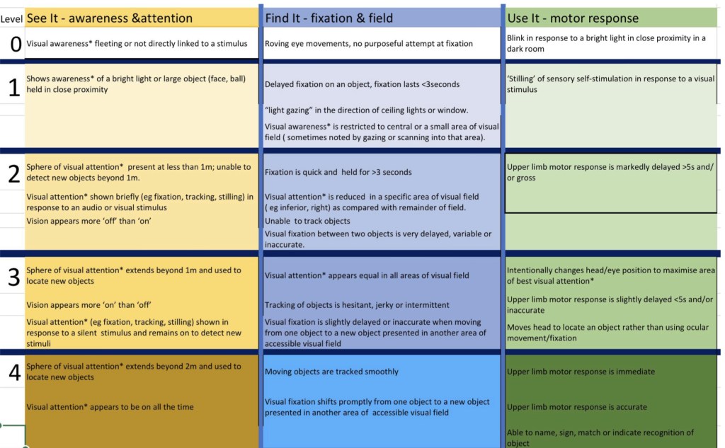 The heterogenous group of children which present on their diagnostic journey to CVI will necessitate a flexible approach, and not all children will be able to demonstrate a visual behaviour to match each of the three columns (see it, find it, use it).